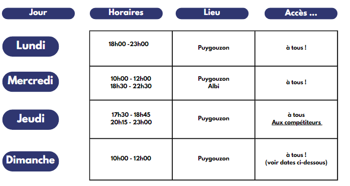Mercredi à Albi : à partir de 20h30, entre 4 et 7 terrains disponibles, selon si l’une de nos équipes interclubs joue ce soir-là